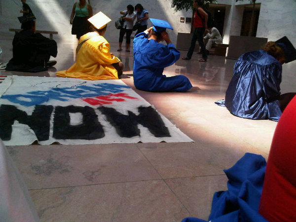 No official news has been reported, but the Facebook page for Dreamactivist.org states that 13 have been arrested already. Undocumented immigrants from Illinois, Virginia, New York, California, Arizona, Kansas, Missouri, and Michigan all came together in the nation’s capital for today’s action. Rivera provides a glimpse into her struggle on another facebook page encouraging others to support her DREAM. She says, “Over the years, I’ve lobbied and presented to many including the college board. Yet, I am still “9ine digits away from my dream” and I am not sure how my childhood friends will react to that. It has been a bittersweet journey and I have given a lot up for DREAM, including my family in the mid-west. But I feel the DREAM coming not just for me, but for my younger sister and the numerous friends that I’ve had the privileged to work with throughout the years.” Rivera is joined by fellow Californian Laura Lopez. I haven’t received word about Orange County’s own, but another OCDT’er posted in McCain’s office notes that police have just arrived there.