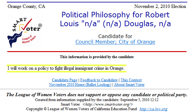Douglas is running for the Orange City Council. He has run before for other seats – and never won. This time however he may have gone too far. This is what he listed as his political philosophy, on his Smart Voter page: “I will work on a policy to fight illegal immigrant crime in Orange.”