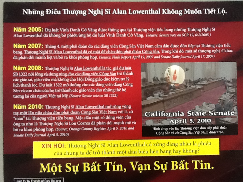 Lowenthal’s bill would “allow the members of the Communist Party to become professors or teachers without the Board of Education being allowed to check their family history,” the mailer said. “The bill SB1322 would open up the way for members of the Communist Party and their children/grandchildren to become teachers to generations of future Vietnamese Americans.”