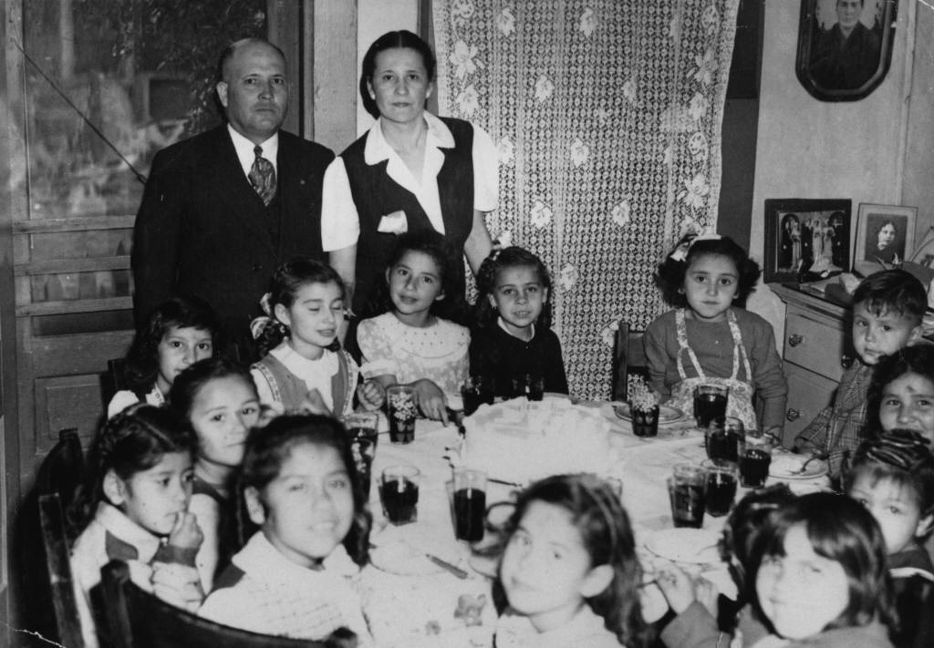 Rose Veyna’s birthday party in 1945 includes friends from all over the neighborhood. Photo courtesy Anaheim Public Library.