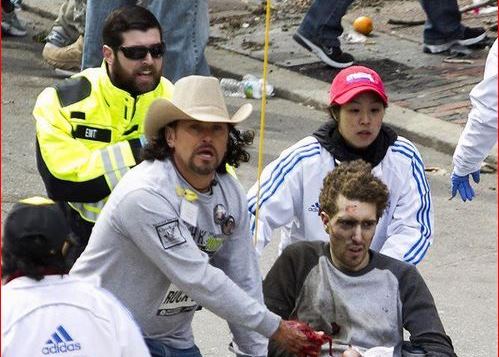 I’m only going to print the top half of this photo, despite that many of you will have already seen it, because it is the stark reality that Kevin Ware’s protruding leg bone only hinted at three weekends ago. The bottom half shows where Jeff Bauman’s legs were blown off. If you want to see it, you can go here. I can tell the story without descending below that thin red tube in the hand of the man with the cowboy hat, Carlos Arredondo.