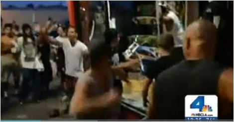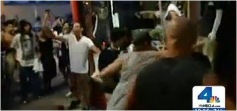 Guy at left in striped shirt: “Hey, this looks like a GREAT opportunity to punch some valiant defender of commercial personal property in the back of the head!”
