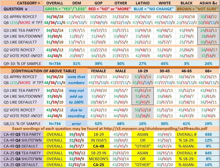 Most of this chart addresses a poll done of 734 registered voters in CA-39 from Oct. 15-17.  The poll consisted of 11 questions, seven substantive ones and four demographic ones, regarding gender, party affiliation, ethicity/race, and age.  Those appear at the left in purple; full question wordings (important to know!) are at the link.