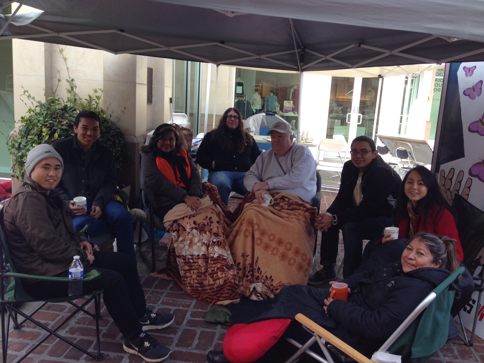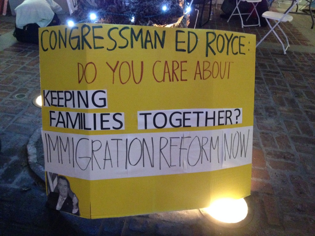 The group “Fast for Families,” which includes people who are fasting to bring attention to the need for comprehensive immigration reform, took their bus to OC yesterday to bring attention to their cause.  Both the traveling troupe and local activists then spent last night in outside of the district office of Rep. Ed Royce, a major opponent of immigration reform, on the Birch Street Promenade in Beautiful Bountiful Brea. The Orange County bus tour is hosted by the Korean Resource Center (KRC), Orange County Congregational Community Organization (OCCCO), Orange County Labor Federation (OCLF), Orange County Immigration Coalition, and SEIU United Service Workers West. They are focusing on Reps. Royce and John Campbell — in Royce’s case because of the swiftly changing demographics of his district.