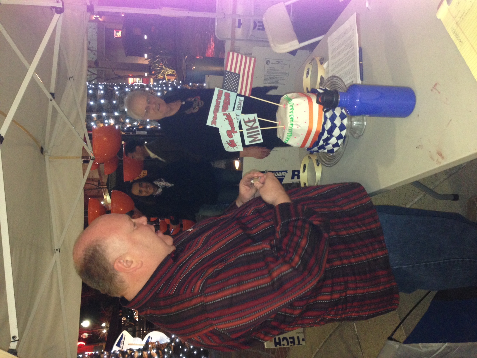 What kind of cake do you bring for a guy who is spending his 50th birthday (and the day after) fasting for immigration reform? Why, a fake cake made out of bottles of water that can be consumed the next day, of course! Here, Mike prepares to “blow out the candle” as Marti Schrank and the cake ‘s”chef” Josie Diamond look on.