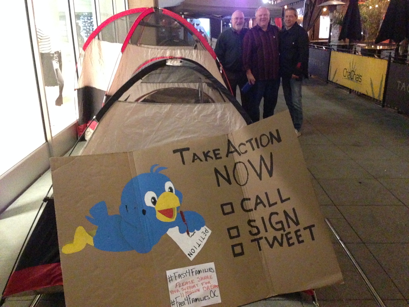 The tweet sign is in place, the tents are lined up, and Jeff LeTourneau (right) and I are there to welcome fasting activist Mike Kinslow (center) to join us in having completed five full decades on Earth — that very day!
