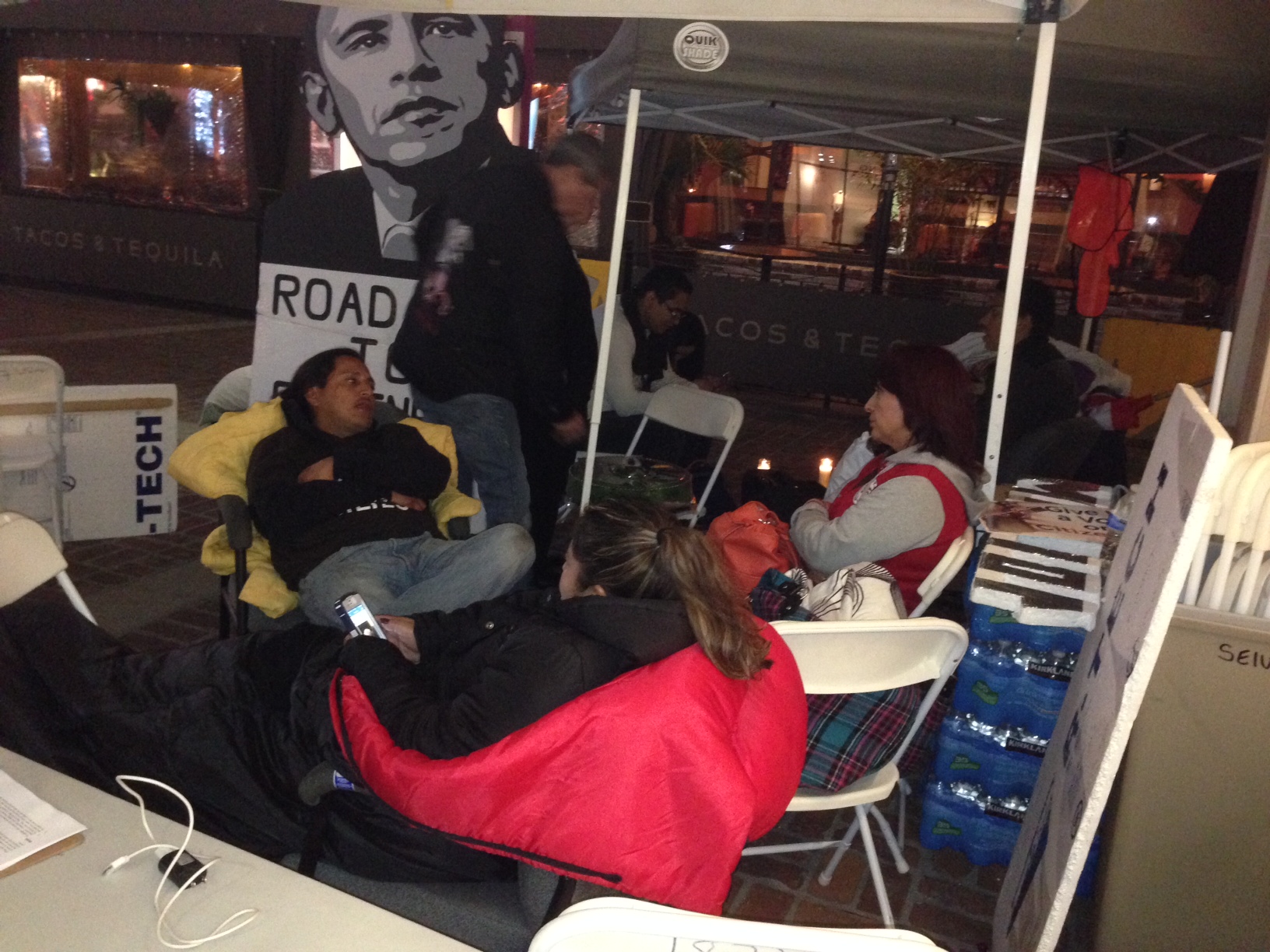Tweet sign, tents, old guys