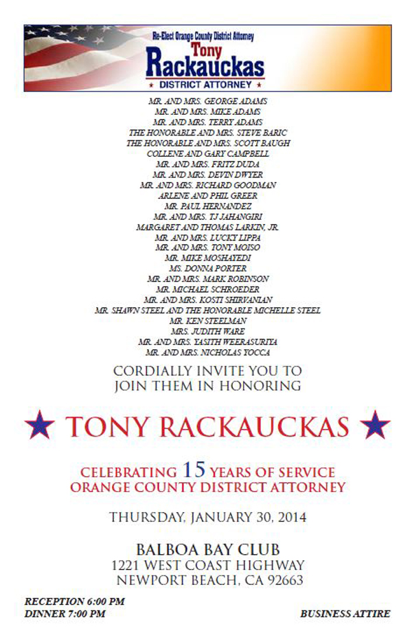 Before the filing period opened, Rackauckas raised a record‑breaking $419,000 toward his re‑election bid this year in one night. The gala event, held at the Balboa Bay Club in Newport Beach, was attended by hundreds of enthusiastic, committed supporters of Rackauckas.