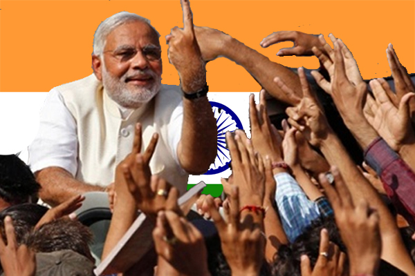 New Indian Prime Minister Narendra Modi shows off his inked index finger to a crowd of supporters.