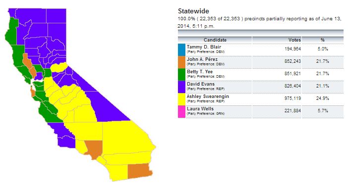 “John Perez pulls ahead of Betty Yee in the race for Controller!” That’s what headlines will scream this weekend, as Perez’ has come from behind to now hold a 322-vote margin over Yee, 852,243 to 851,921. OJB readers knew that something like this was likely coming — check the later updates — because small counties (most notably Perez-dominated Imperial) had already finished their counts but either apparently not reported those post-Election Night results to the Secretary of State’s office or the Secretary of State had failed to update their numbers.