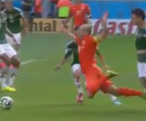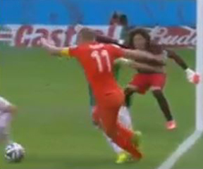 Going into a holiday weekend tomorrow, we know that people will need something to argue about until Monday. Well, we’ve got the mother of all argument dancers here today. I’ve snagged 26 screenshots from the 4 second video of Robben’s dive that led to a fateful free penalty kick by which the Netherlands beat Mexico. And they are clear. Robben was fouled by the Mexican defender Marquez.