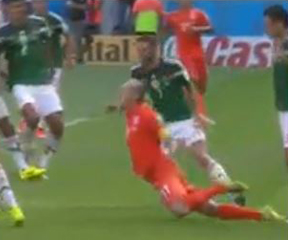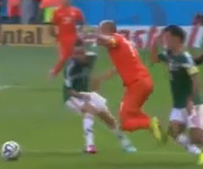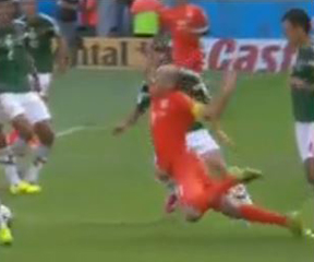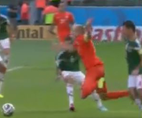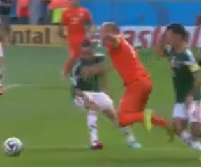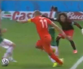 No foul. In the box it’s got to be bad. And Robben wasn’t going anywhere – he’d already pushed the ball too far from himself to make any sort of play. The Mexis had him surrounded, too. The flop was quite acrobatic, though.