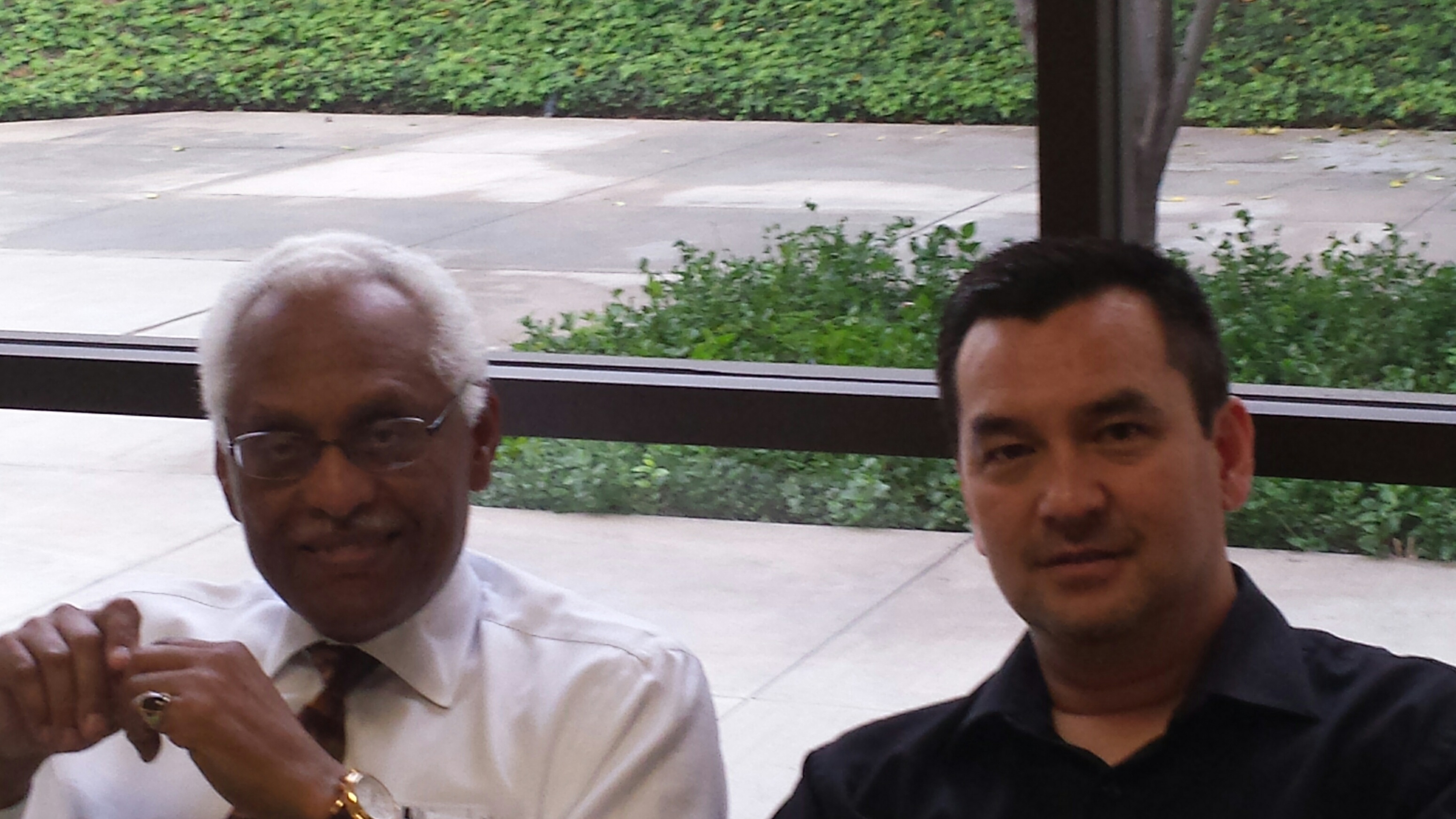 Guillory with County Clerk Hugh Nguyen — himself in the process of being beset by Troy Edgar and Brett Barbre — waiting for their turns in line at the OC Registrar of Voters’ office on Friday afternoon, March 7, 2014. Guillory does not look particularly ruffled.