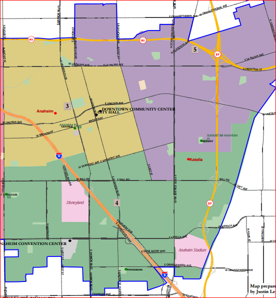 It comes down to this: Lewis St. vs. State College Blvd.  Reyes 2 divides District 4 from District 5, south of Ball Rd., at Lewis St.  Chuchua 6, 9, and 10 divide them at State College.  That area between Lewis, Ball,, State College and Orangewood has another name: it’s the western portion of the Platinum Triangle.  (Technically, the “Platinum Triangle” proper is south of the Union Pacific tracks — which cross State College south of Cerritos Ave.)