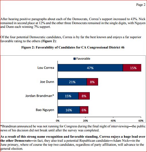 Nguyen’s 8% showing in Correa’s poll suggests he, and not former State Senator Joe Dunn (who came in at 5%), is the best hope for progressives in CD-46 and tries to brand Correa []as Democratic yet not progressive. To have to admire Nguyen for using another candidate’s, allegedly flawed, poll for a “desperate fundraising stunt.” He saves money by not having to do his own. But in using Correa’s poll, Nguyen lends credibility to it.