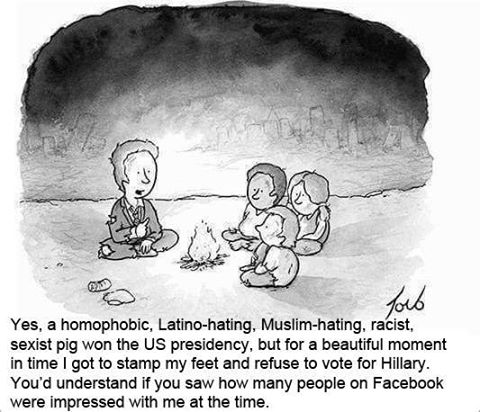 So what do we not want to do right now?  Right — give Hillary the impression that our votes are in the bag!  We have to avoid commitment to her — sorry, “Her” — at this early stage because we know that she’s going to turn into Olympia Snowe by election day if she possible can.  And the only way to do that in good faith is to really mean it.  I’m not going to vote for Trump, but that doesn’t mean that — if she doesn’t give us lefties some serious reason to support her (like picking Elizabeth Warren (or, better yet, Keith Ellison) for VP — I will vote for Hillary.  (And before you say “how can you support Trump by not voting in the Presidential race — I’m in California, people: if Hillary is in any danger of losing California without my vote — and probably hundreds of thousands like me, then she’s already lost the election.  You care so much about what we each do with our individual vote?  You still have time to move to Ohio and register to vote there.  Go.  Shoo!)