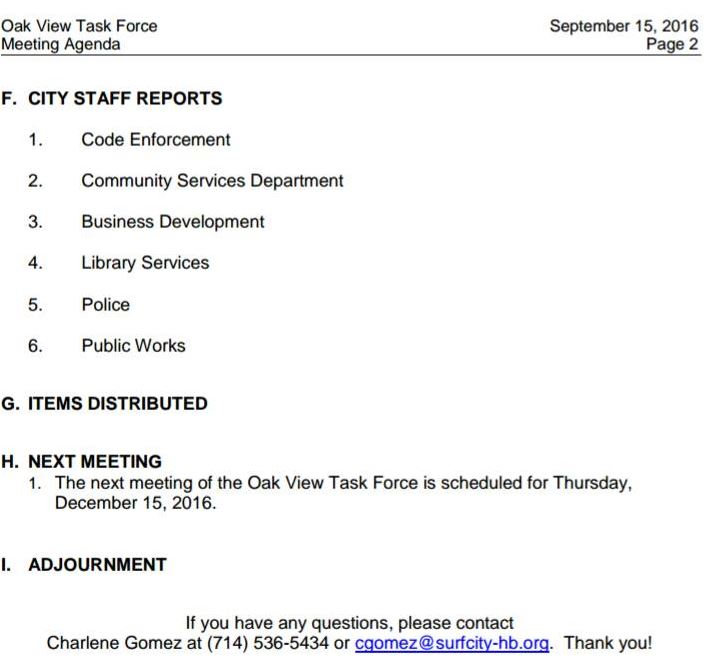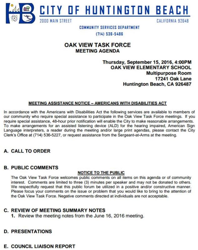City of Huntington Beach “Oak View Task Force” is tomorrow Thursday, September 15, 2016 at 4:00PM in the Oak View Elementary Multipurpose Room (MPR) [17241 Oak Lane Huntington Beach] the quarterly meeting with city staff and partners invite you the residents.