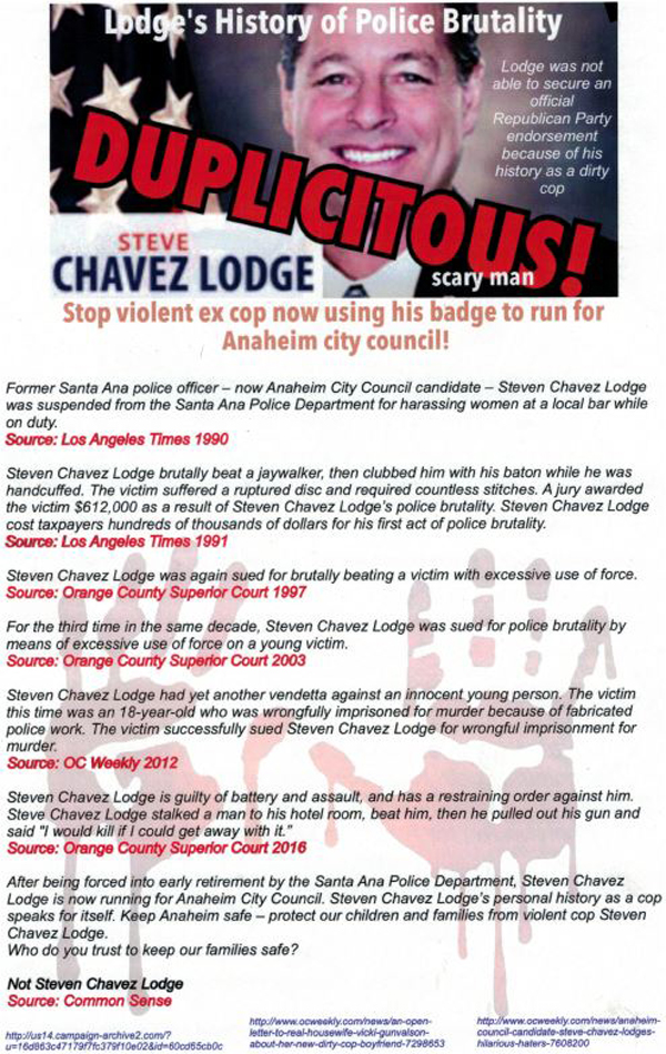 Nancy is an OIDV activist — it stands for “Officer Involved Domestic Violence,” of which there is PLENTY — and unofficial counselor to those affected by it, as well as a frequent critic of excessive use of force by police in Anaheim and elsewhere. She’s not only smart — she’s dogged, and she has compiled an eye-popping fact sheet on Steve Lodge. Before getting to the poop stuff that draws you helplessly into this story, let’s take a look at her flyer.