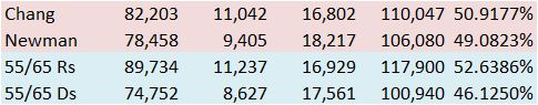 Since the “Older VBMs” report came out at 8:05 p.m. on Election Day — these are the Vote-By-Mail ballots that were mailed in no less than about five days before the election — Chang has done relatively poorly in OC.  She was up by over 5,700 votes based on the “Older VBMs” (which skew conservative), 42,794 to 37,066.  In votes coming in since that time, Newman has picked up 41,392 — and Chang has only 39,409.  She had 53.6% of the OC vote in Older VBMs; she has 51.2% of it now.  In votes since the Older VBMs came in, she’s receiving about 49.0% — 4.6% below where she was in the first release of data.  That would be the best guess for how far she’s dropped in LA and SB as well.  Remember, probably about half of those Older VBMs came out in the first week of voting — before the worst of Chang’s mailers hit, and hit, and hit again.