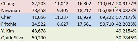 But that’s not what we see.  She’s running 7,500 votes behind the combined vote total of Chen and Young Kim.  So if 4,000 people switched from Chang to homeboy Newman down here, another 3,500 just skipped the race altogether.  That’s bad — and you can probably chalk it up to negative “scandal sheet” campaigning.  (Yes, Newman went negative too — but it was about Chang’s easily disproven lies about herself, which people seem not to mind as much.)