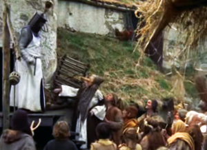 In this scene, in case you’ve been living in a cave with a killer bunny and have never seen the movie, villagers bring to their local nobleman a woman whom they accuse of being a witch.  (Apologies to witches for referring to them below as “monsters.”  Don’t hurt me.)  One piece of evidence: she has a long carrot-shaped nose, which is in fact a carrot they have taped to her face.  She’s dressed in witch’s garments (thanks to them) and they even have testimony from one villager that she turned him into a newt.  (He explains his not appearing to be a newt with “I got better.”  Along with a faulty scale, which appears to convince even her, this suffices to justify the woman’s execution for witchcraft.