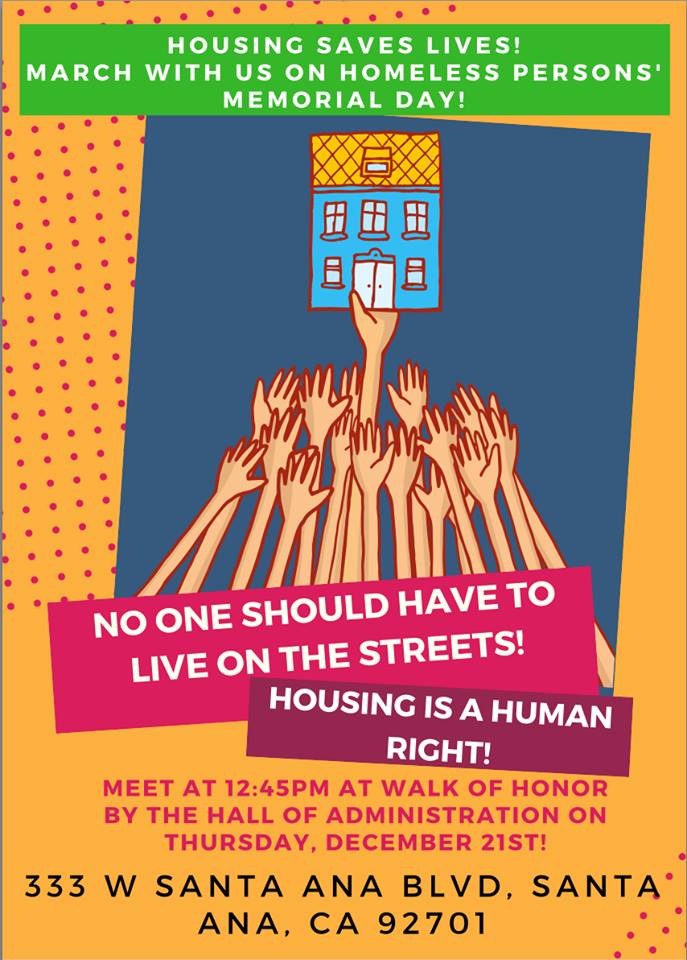Today is “National Homeless Memorial Day.” (I didn’t know it was “National” until today; locally it’s commemoration has been driven largely by Anaheim homeless activist Tim Houchen, who seems perfectly capable of coming up with a stirring idea like this. While we certainly do have a problem with homelessness here in OC, and while our homeless people do die needlessly — from violence, from transmitted disease, from neglect of treatable medical conditions — for people like me who’ve spent over a decade living in cold weather one can easily picture the image that likely spurred creation of the holiday: what seems like annual (or much more frequent) images of homeless people homeless people dying of exposure. Homeless woman dies frozen to death on park bench. Homeless man found buried under snow drift in street. Homeless teen dies after being admitted to emergency room with what witnesses described as “bluish skin.” Complications from frostbite. Complications from pneumonia. Complications from injuries sustained in a fall from trying to get to better shelter.