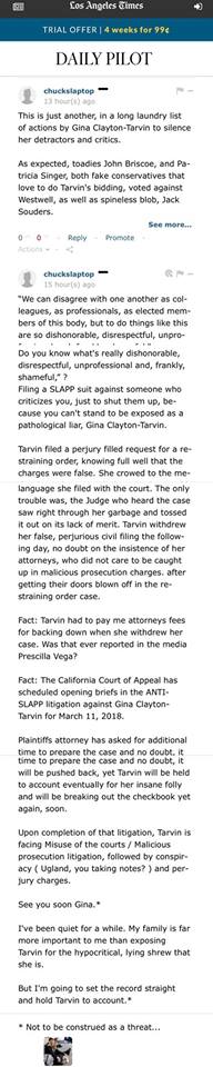 Westwell complains that he’s afraid that Tarvin will try to sue him over his speech, citing her having sought a restraining order against local web logger Chuck Johnson.  Westwall is apparently stupid enough to think that flipping off members of a board in a meeting — and lying about it by claiming that a disability prevents him from raising his hands without extending his middle finger — is somehow protected from a motion of censure.  This means that he is pretty dumb, and if he tries suing OJB for defamation, he will be asked whether his claim about his disability is true — and if it was a joke, why he raised it in his defense against harassment.