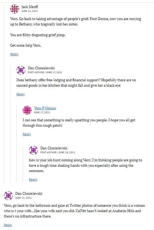 So Chumley knows that this is coming from Donna rather than Vern under Vern’s name, but he wants people to believe that it’s true nonetheless, because it suits his purpose of character assassination.