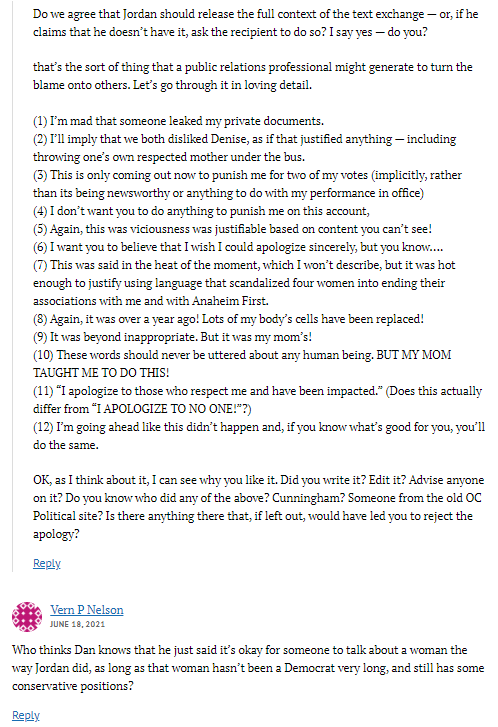 Something has been missing from discussion on Lib OC about Jordan Brandman’s “not even a non-apology apology” for his calling his former colleague Denise Barnes a vile name preceded by an enhanced obscene adverb and accompanied by a threat to commit an act of violent maining once favored by certain Latin American dictators (which he asserted he could use because he learned it from his deceased mother): my own submitted comments.