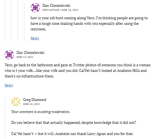 To try to clear more of my backload of deleted comments, this exchange occurred on a different post on Lib OC. (I was poking around, not having been there for about a month, and it was ostensibly on MWDOC policy — a board we cover extensively here and one for which I’ve run — mostly just to make point about Poseidon, pollution, and corruption — twice.) Chumley was apparently parroting what someone with money and a pecuniary interest had told him about MWDOC. And he ends up slamming and threatening two exceptionally good council members — both OJB endorsees, perhaps not incidentally — to make his point. Vern takes him on regarding both MWDOC and Brandman, and Chumley blathers on MWDOC and makes some interesting claims about Brandman — which, having some experience with taking depositions and confronting dubious witness testimony, led to the retort below.