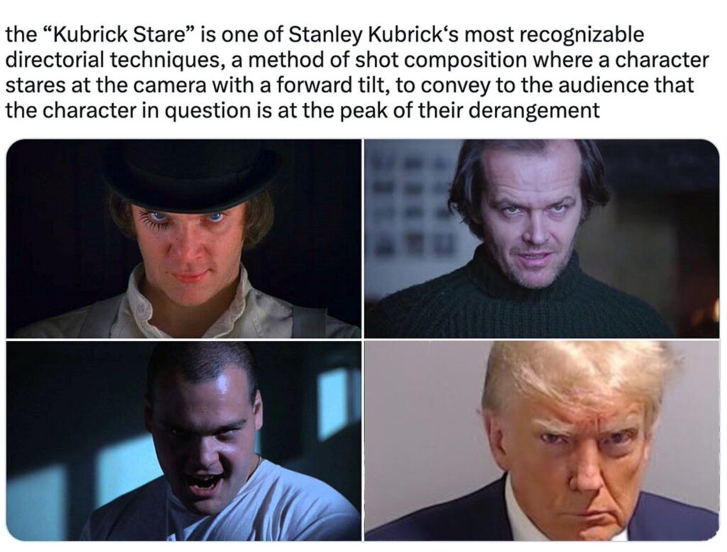 Trump’s power pose comes off as cartoonish. I’ve already seen it in a meme where he’s telling some attendant that his diaper is full, but I find that unkind. Not unkind enough for me not to mention it here, obviously, but still … unkind.) It comes off as meticulously posed and staged. I’d be afraid of this person if it were my boss in a workplace situation, but as for physical menace — not really. At least not for me, as I am not am attractive woman under 50, as E. Jean Carroll was when Trump raped her.