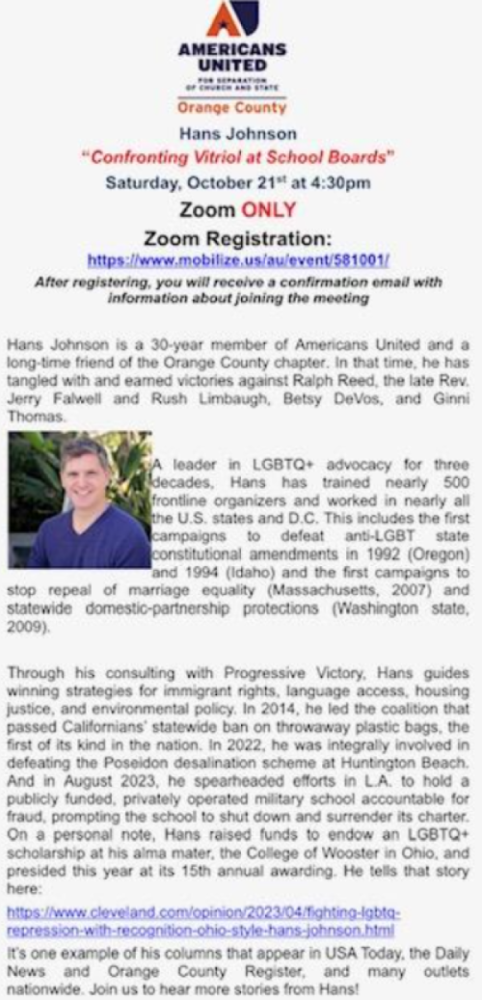 Hans is putting on a Zoom seminar next month for the Orange County chapter of Americans United for Separation of Church and State, Saturday Oct. 21 at 4:30 p.m. (Sorry for the fuzzy image; the registration link is here and that’s all you really need.)
