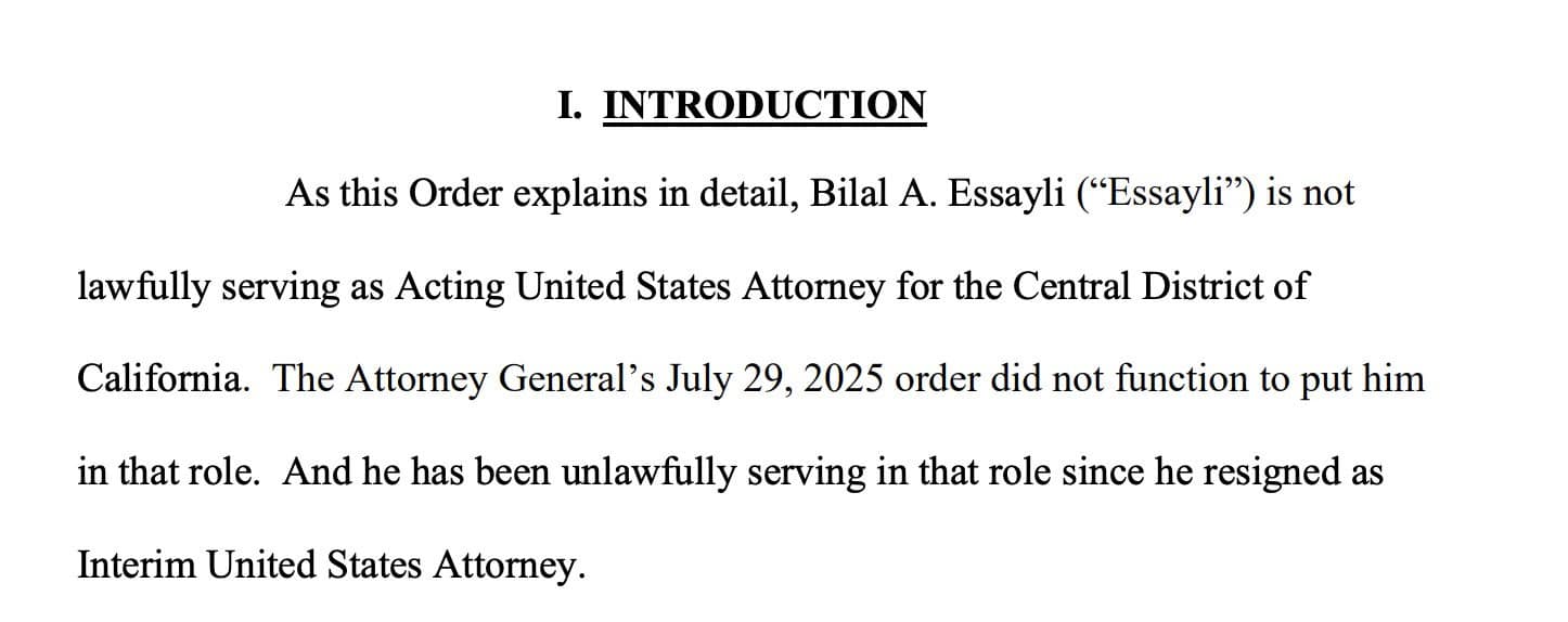 On October 28, 2025, a federal judge ruled that Essayli’s authority as an interim appointee had expired as of July 29, 2025. Judge J. Michael Seabright wrote that “Essayli unlawfully assumed the role of Acting United States Attorney for the Central District of California”, stating that “He is disqualified from serving in that role”.[23][24][1]