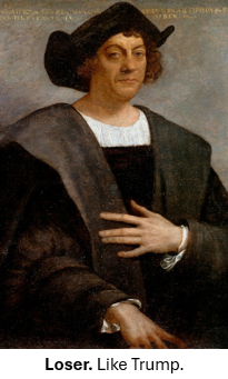 3. And in fact Columbus does have a lot in common with their Orange-y God. Not that Trump would have ever had the guts to sail across an unknown ocean, but he sure would have stolen everything and everyone once he got there, feeling entitled to it all because might makes right, and LOOK I’m white! And these MAGAts salivate over that greed and cruelty, calling it “strength.”