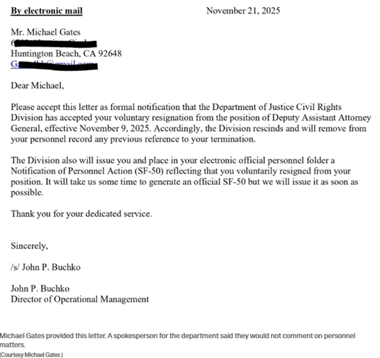Friday the 21st, possibly in response to Gates’ furious threats of litigation (being terminated for cause gave HB a teensy bit of pause about re-hiring tho’ I’m sure they would’ve anyway), the DOJ provided him with a letter confirming that he DID resign voluntarily.