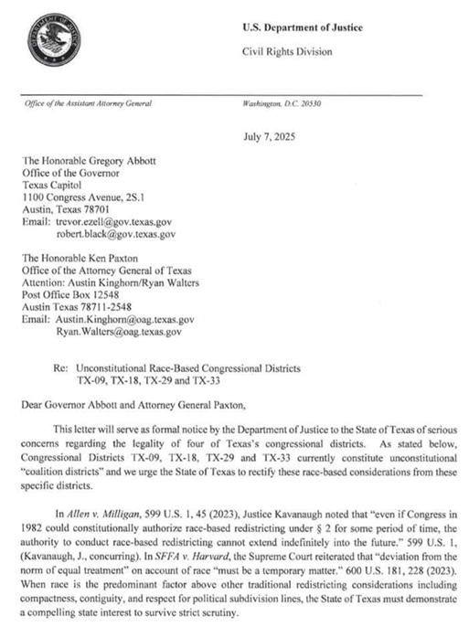 Texas Republicans seized on this DOJ guidance as justification for their special legislative session. Abbott cited the letter directly when adding redistricting to the agenda, publicly stating his goal was to “eliminate coalition districts” and comply with federal directives, framing it as a racial compliance issue rather than pure partisanship.