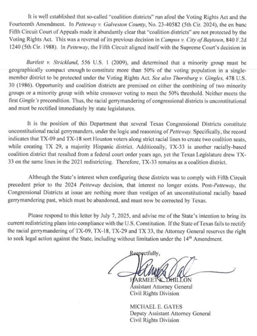 This letter, co-authored by Gates & Dhillon and sent to Texas Governor Greg Abbott and Attorney General Ken Paxton, warns that four of Texas’s congressional districts (specifically coalition districts in the 2021 map) were unconstitutional because they were drawn based on race in violation of the Voting Rights Act (VRA), potentially subjecting them to legal action if not redrawn.