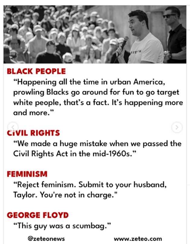 That’s what Charlie Kirk represents. Cultural regression. He represents the backlash against progress. Voltaire said, “To the living we owe respect, but to the dead we owe only the truth.