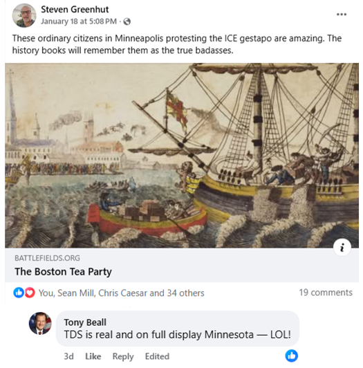 In Beall’s view, anyone who would protest the violence of ICE must be “deranged,” must have “Trump Derangement Syndrome.” A few days ago OC’s legendary conservative columnist Steve Greenhut posted “These ordinary citizens in Minneapolis protesting the ICE gestapo are amazing. The history books will remember them as the true badasses.” And the Rancho Santa Margarita Mayor responded “TDS is real, and on full display in Minneapolis – LOL!”