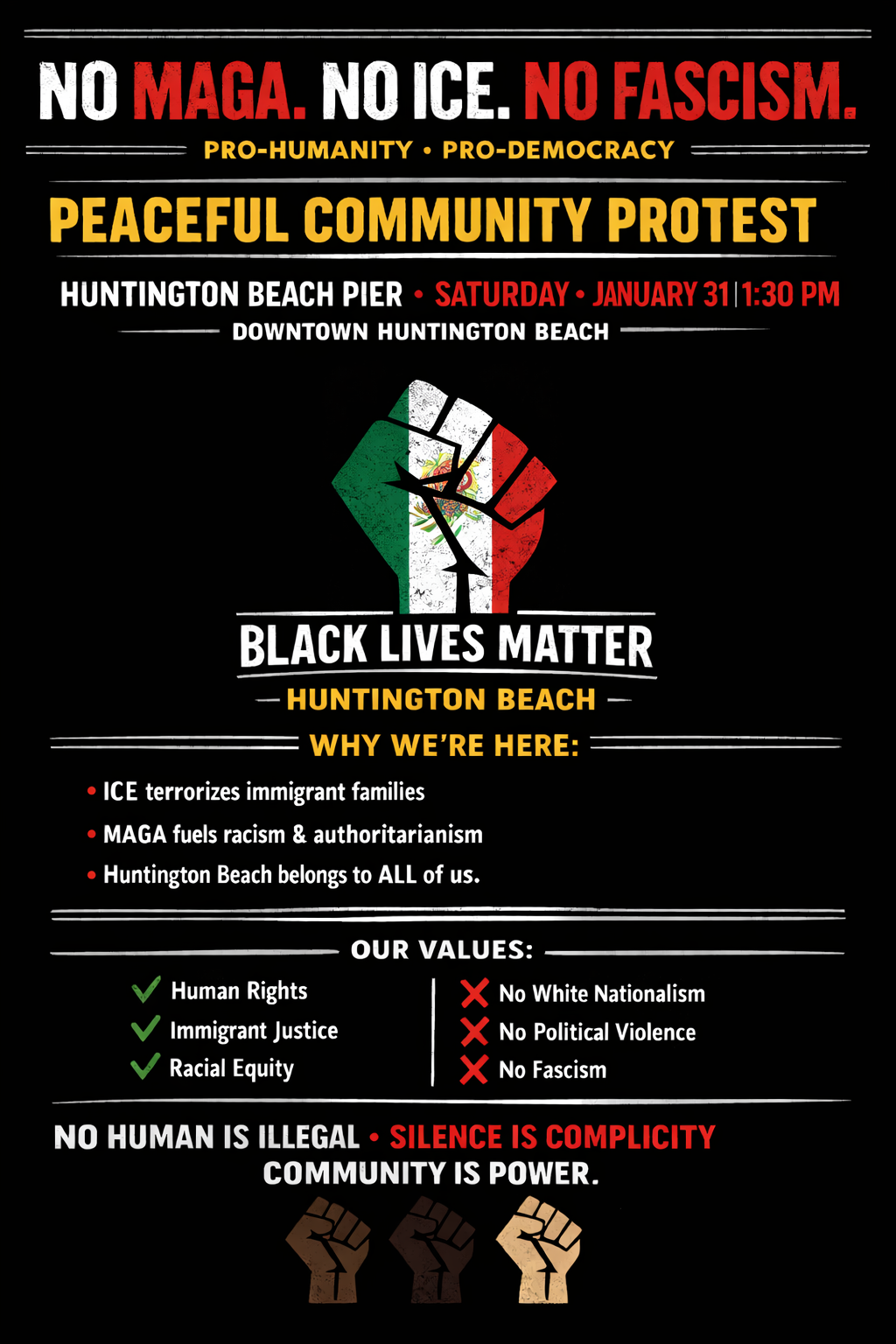 Huntington Beach is not separate from what’s happening across the country. What happens in Minneapolis, at the border, or in federal immigration enforcement does not stay there. These systems travel and so do their consequences.