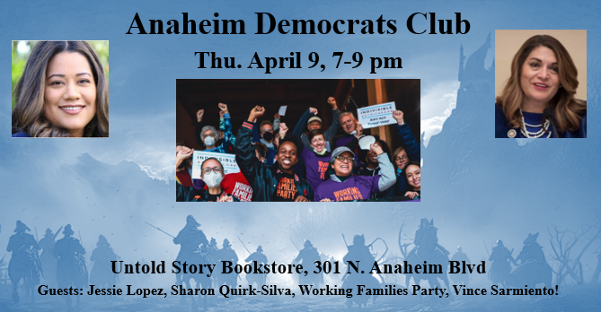 2. The Anaheim Democrats Club has a great meeting coming up tomorrow night (Thursday April 9, 7pm, the Untold Story Bookstore, 301 N. Anaheim Blvd, with progressive Assembly candidate Jessie Lopez, assemblywoman Sharon Quirk-Silva, speakers from the Working Families Party – who want to start a partnership with us – and possibly Supervisor Sarmiento.)