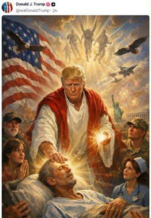 This blog generally avoids Trump’s day-to-day escalating madness. But this is just too good and too weird and stupid, all at once. I’m sure most of you know that, right after trashing the Pope, Trump posted this AI pic of him as Healing Jesus. (And I still haven’t heard much mention of the demonic figure floating in the very top center)